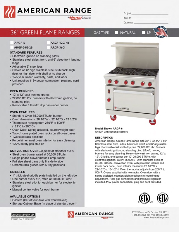 Green Flame series range 36″ with the option of open burners or griddles or a combination