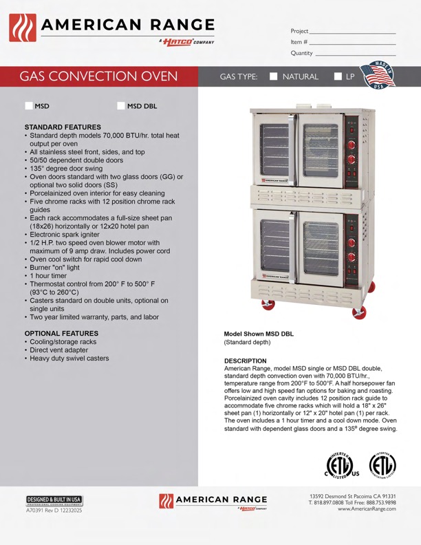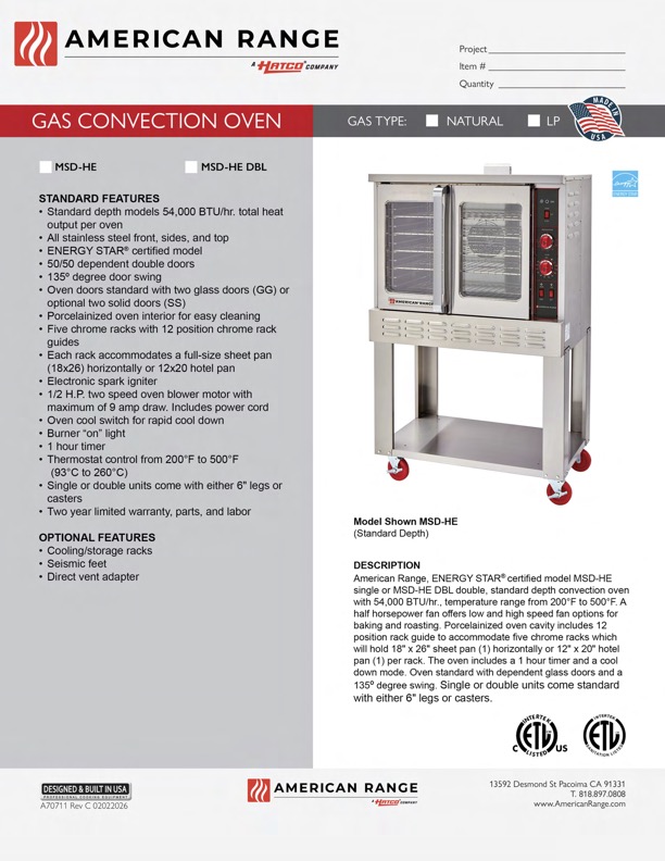 Porcelainized oven cavity includes a 12 position rack guide to accommodate five chrome racks which will hold 18″ x 26″ sheet pans horizontally or 12″ x 20″ hotel pans one per rack.